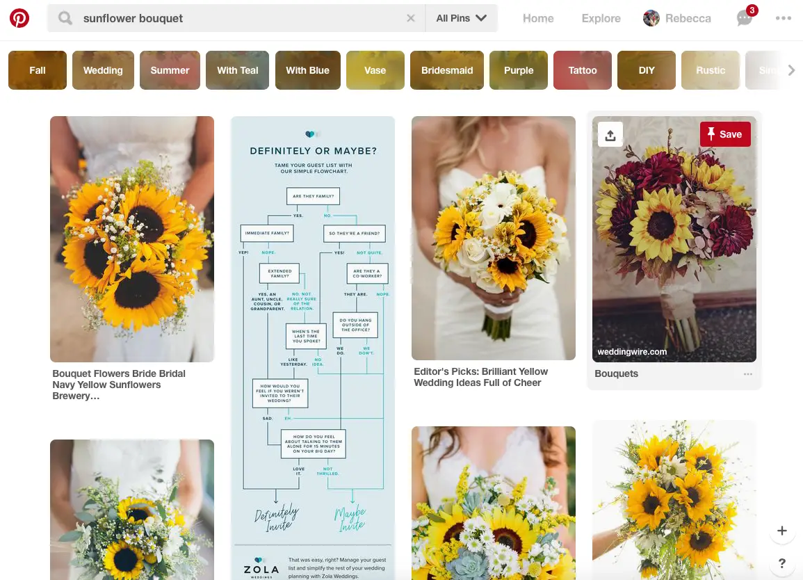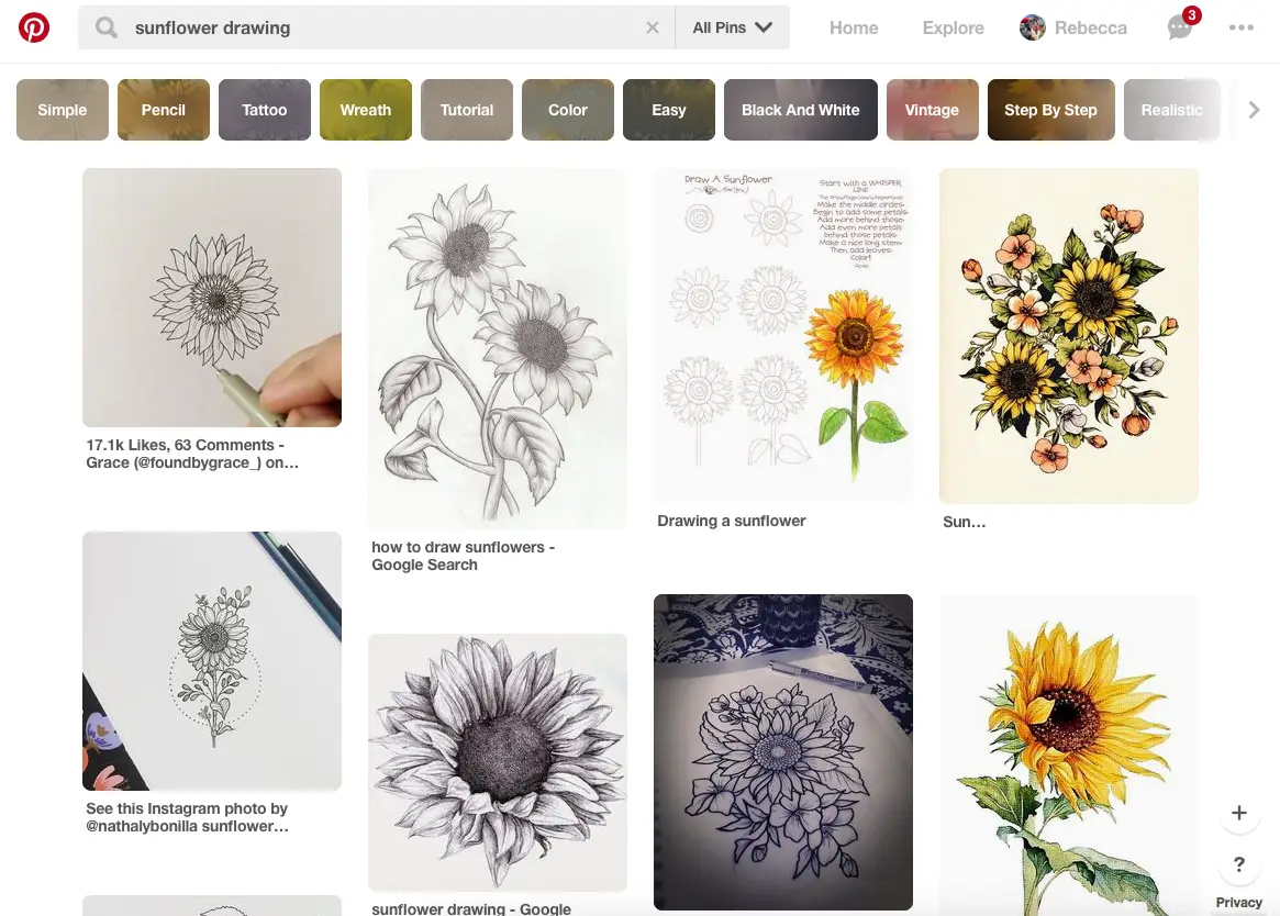 Do you have a flower in mind? Great, go ahead and put in a search for it on your preferred search engine. Start simple. As you find images you find interesting and inspiring, save them. Start saving them wherever you’ll have easy access to them. I have a Pinterest Board I put anything floral related, so I know where to go look if I’m feeling uninspired! Also, remember to narrow down the search and try different things. Here are some ideas: “sunflowers,” try searching for: “single sunflower” “sunflower bouquet” “sunflower drawing” “sunflower tattoo” etc. You’ll want to get ideas of color, shapes, leaves, similar flowers, etc. Having this information will help the whole process but don’t save too many that you feel overwhelmed!