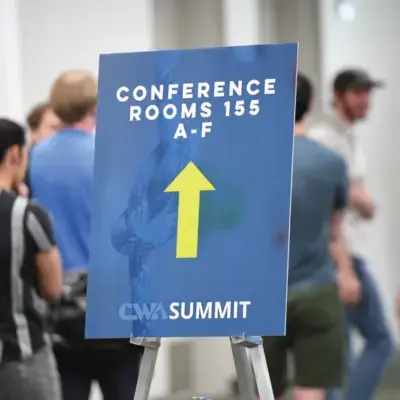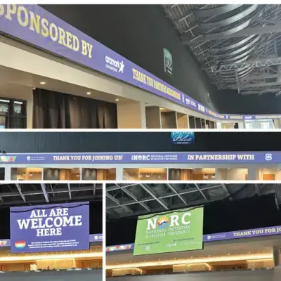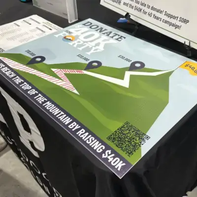 I’ve done large registration desk designs, large digital displays, four-sided meterboards, 70+ page programs, show cards, and created custom signs like the ‘Welcome to the Campfire Sessions’ sign below.