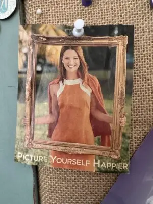 That same semester I was also in an art class. I can’t remember what project we were working on, but it required us to cut up magazines. When flipping through magazines I came across an image — a woman holding a frame with the words “Picture Yourself Happier.” I cut that image and I held onto it, thinking about what my life could be. I still have this image, it hangs in my office. It took coming across this image and all the other circumstances I was facing as signs of a changing path for me.