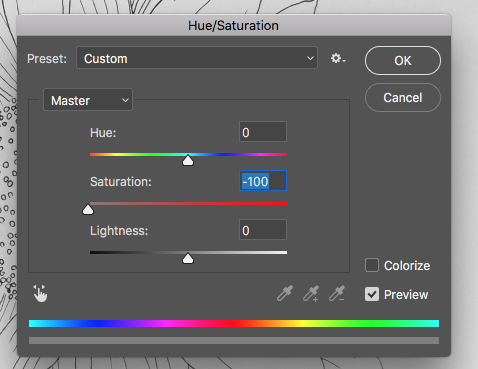 Next go to Image > Adjustments > Hue & Saturation. Bring saturation all the way to the left (-100).