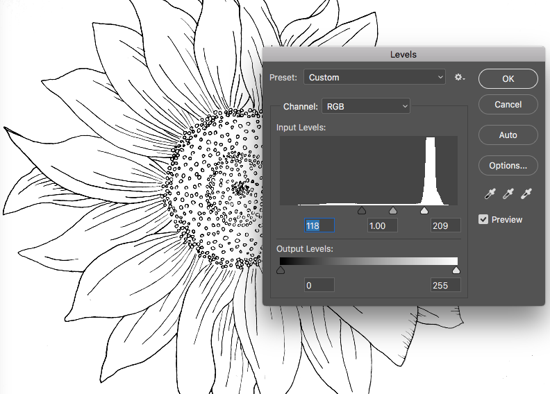 Next go to Image > Adjustments > Levels. Bring the white (on the right) to the left to make your whites brighter. Bring the black (on left) to the right to make your blacks darker. You want your image to be as black/white as possible.