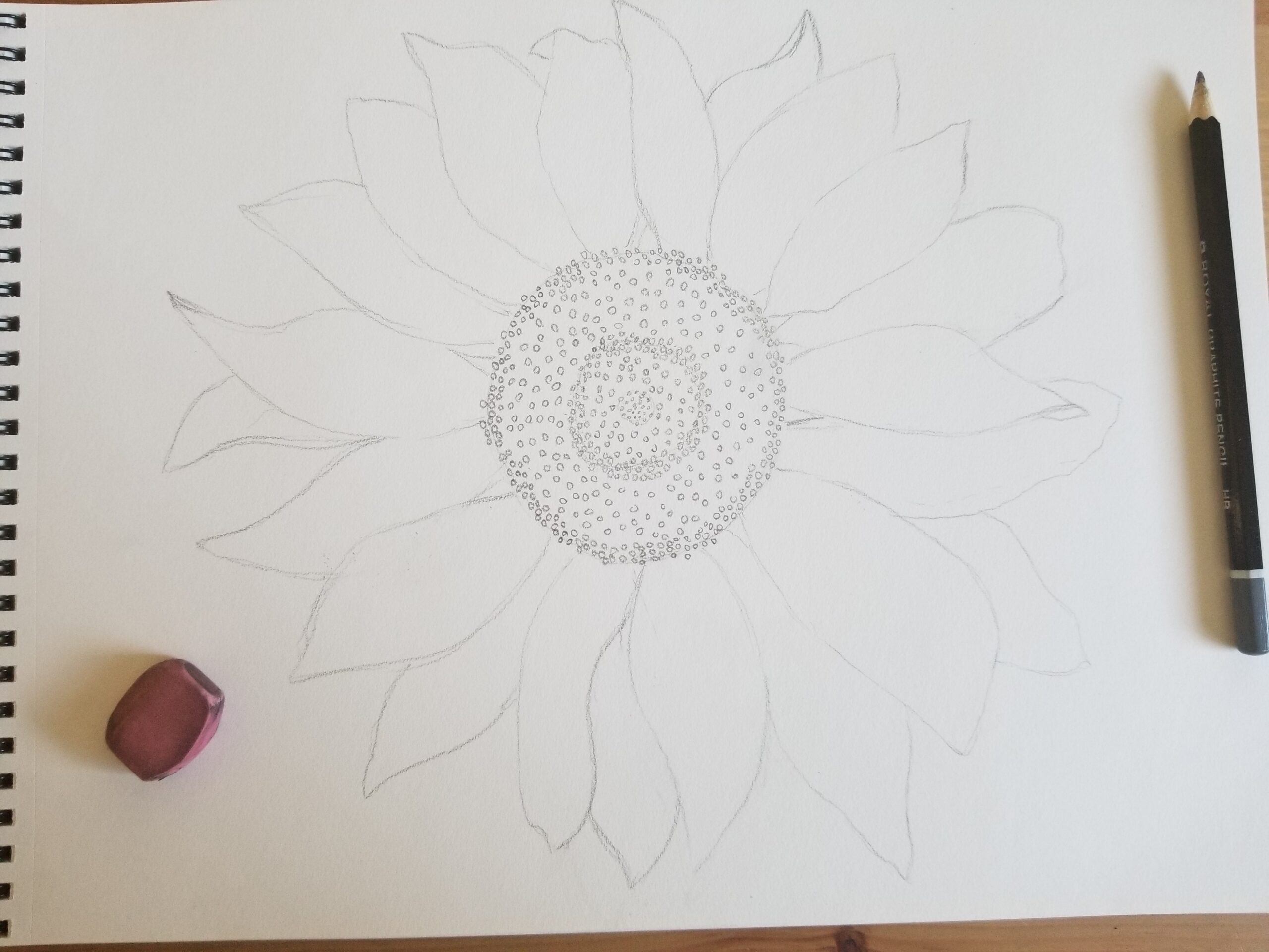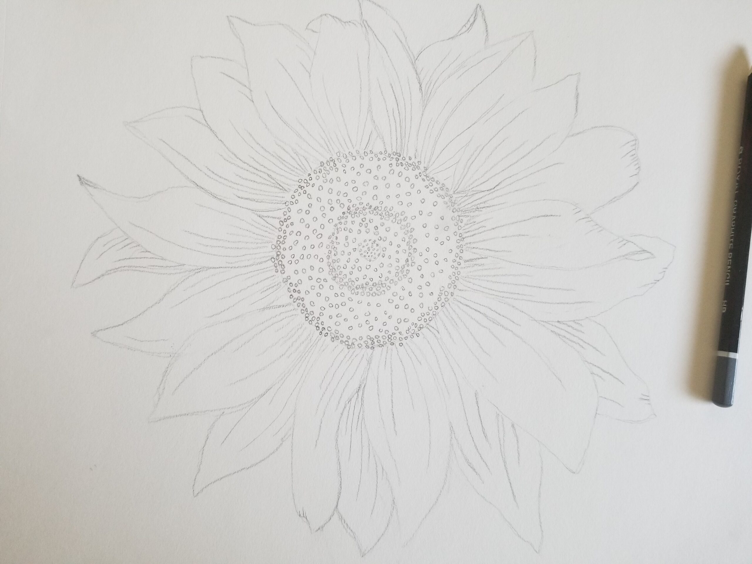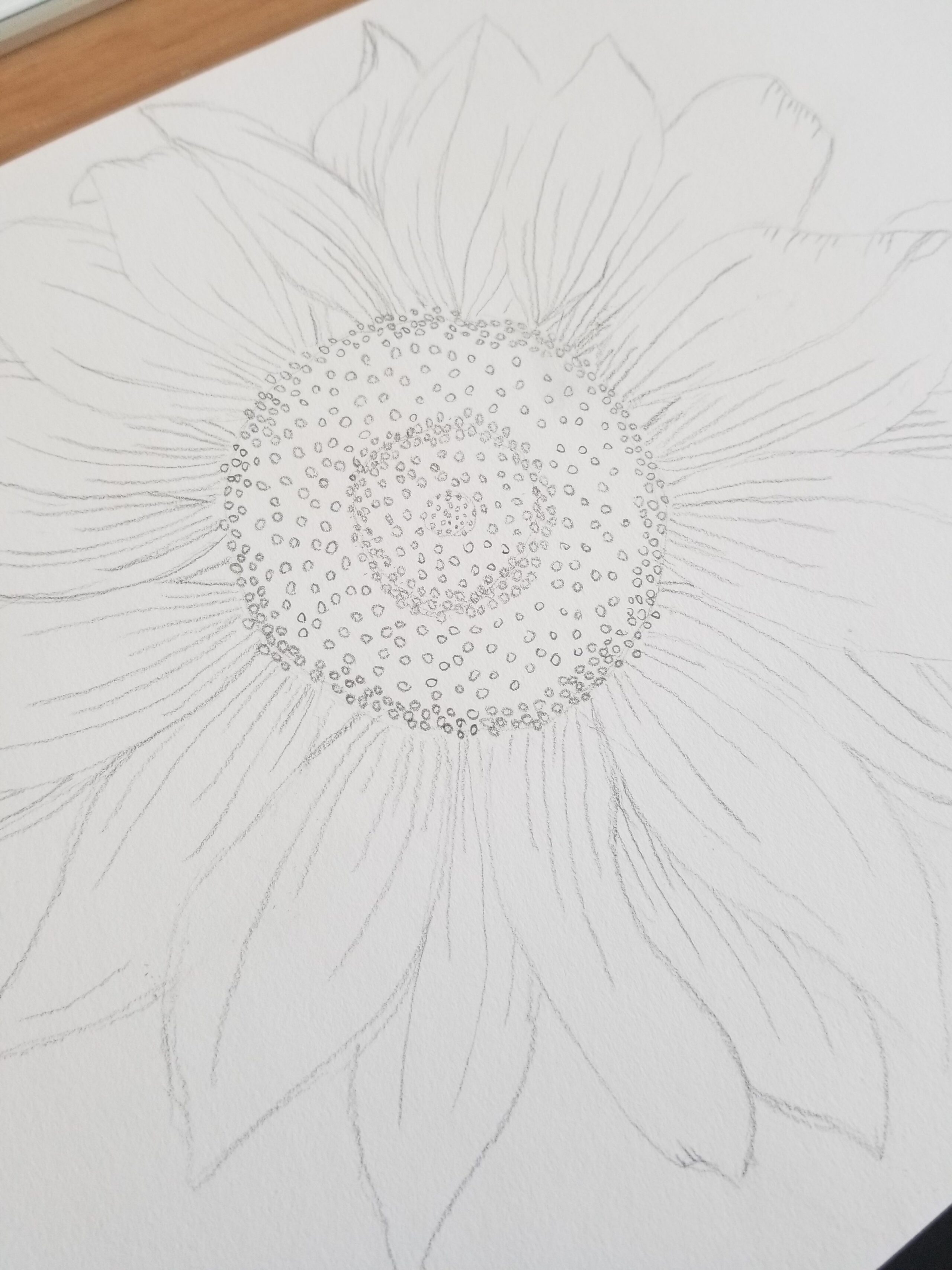 Start at the center {pistil} of the flower, this will help you reference out distance and spacing. For a sunflower, it is drawing a {not perfect} circle. Notice the details. Thing about curved lines and dots to help capture the detail.