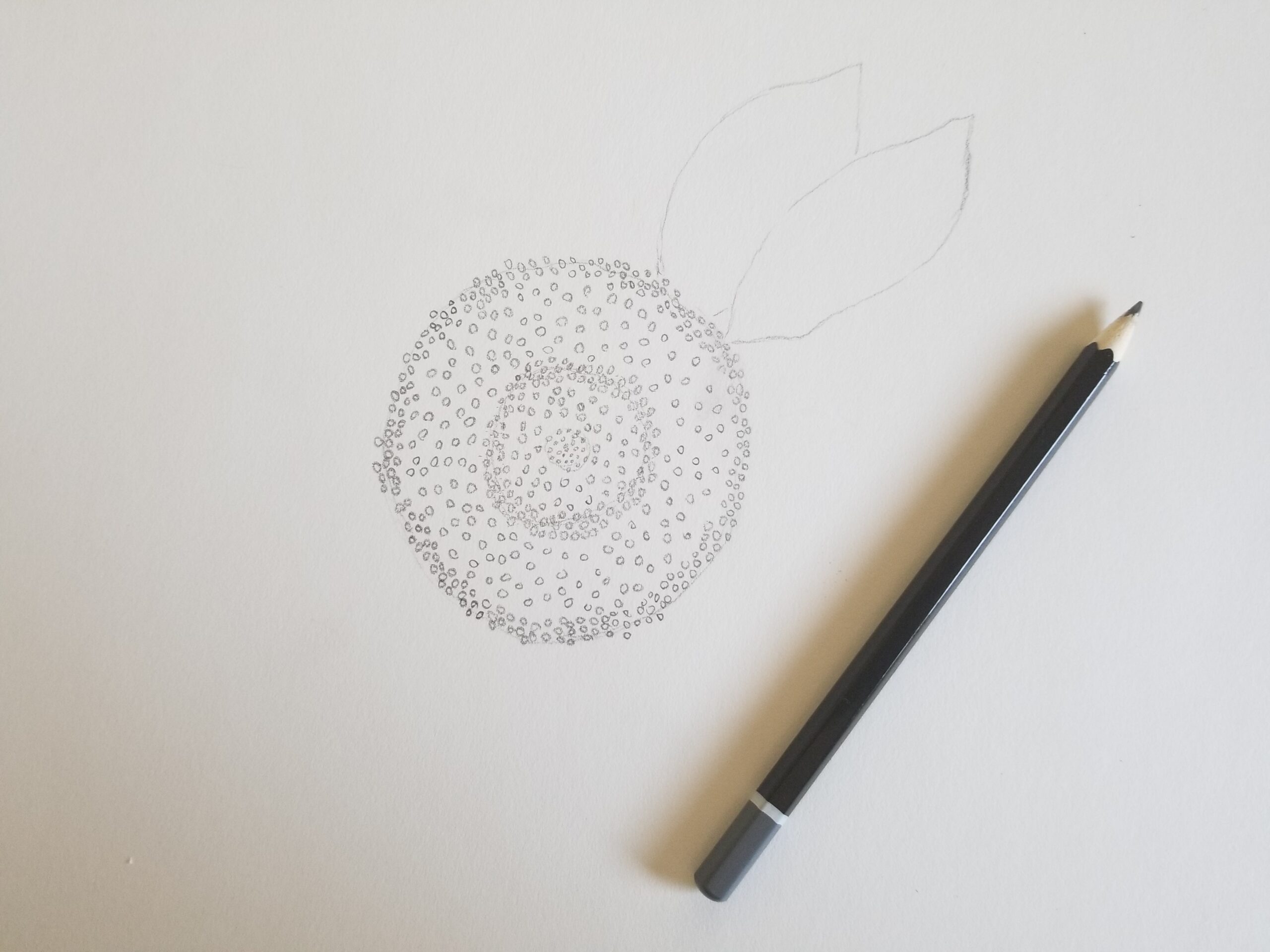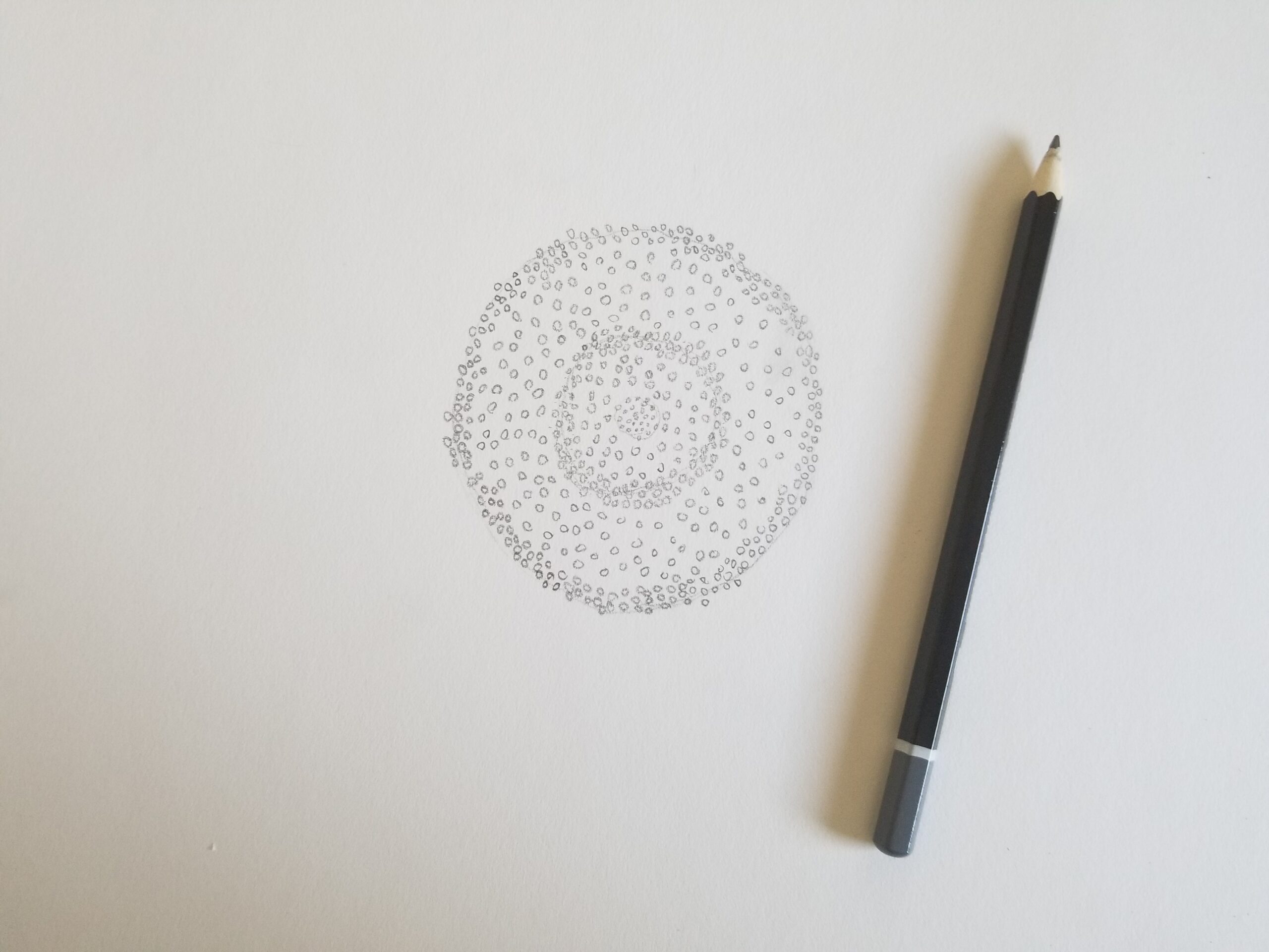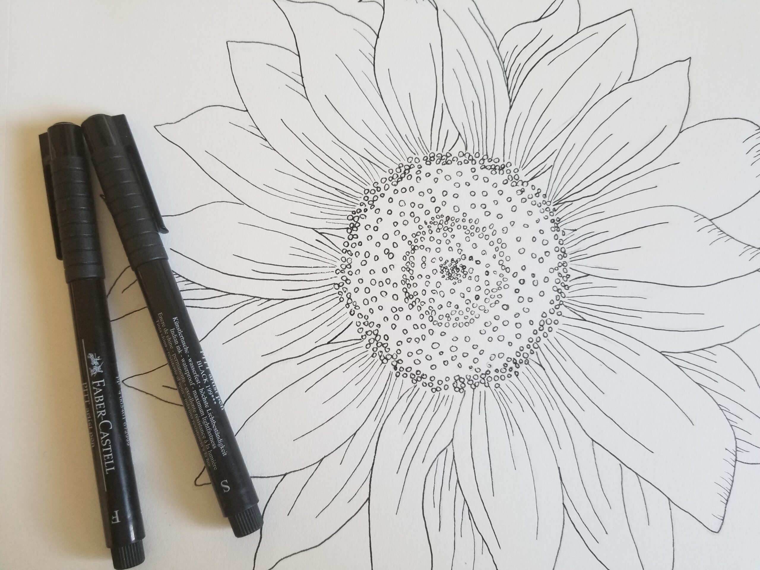 Start at the center {pistil} of the flower, this will help you reference out distance and spacing. For a sunflower, it is drawing a {not perfect} circle. Notice the details. Thing about curved lines and dots to help capture the detail.